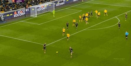 所以,当狼队在进攻端能够有所盼头,加上主场作战,也需要尝试向前的压力下,曼联确实不会缺少空间,于是在第25分钟,曼联在前场完成抢断,库尼亚和布鲁诺的配合没有踩到点儿上,但还是打出了进球: