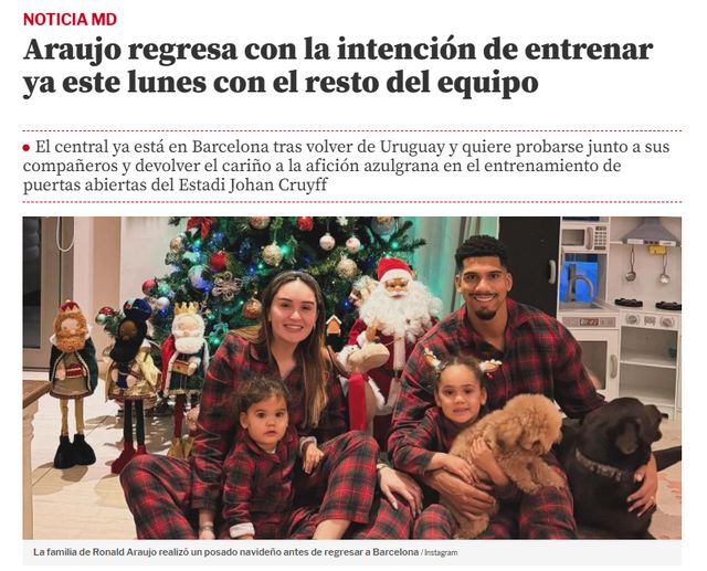 《世界体育报》指出,巴萨的圣诞假期结束,本周一,巴萨全队回归训练。阿劳霍也将回到约翰-克鲁伊夫球场,在6000名球迷面前参加训练。
