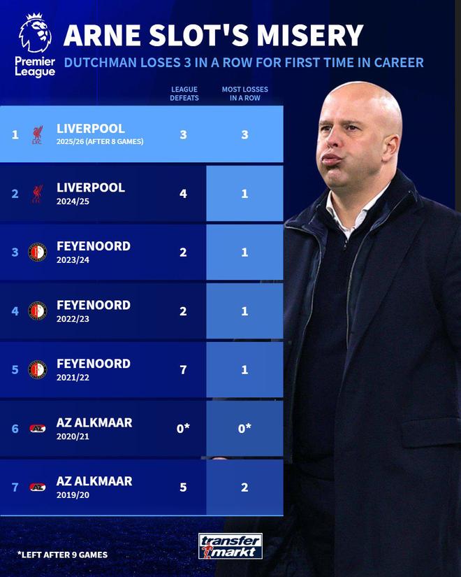 德转:斯洛特生涯首次遭遇联赛三连败,此前五个赛季从未连败